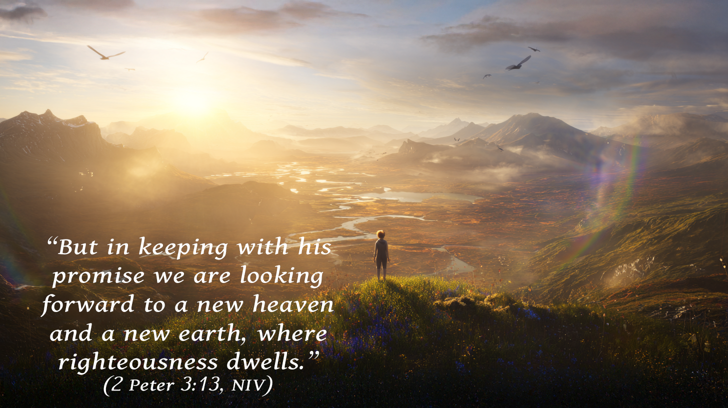 2 Peter 3:13 points us toward the promise of God’s ultimate renewal—“a new heaven and a new earth, where righteousness dwells.” It reminds us that while the world as we know it is temporary and often marked by decay and injustice, God is preparing something enduring and pure. For believers, this isn’t just future hope—it’s present motivation. We live faithfully now because we trust in God’s coming restoration. Every act of love, mercy, and truth becomes part of that unfolding promise—a glimpse of a world made new, where only righteousness and peace remain.