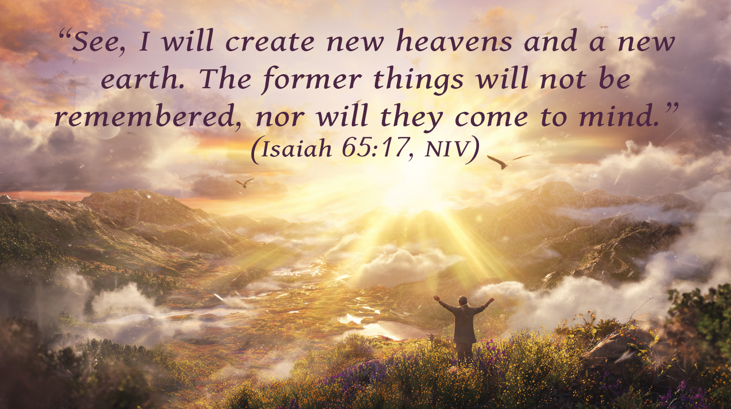 Isaiah 65:17 — God promises, “I will create new heavens and a new earth; the former things will not be remembered.”